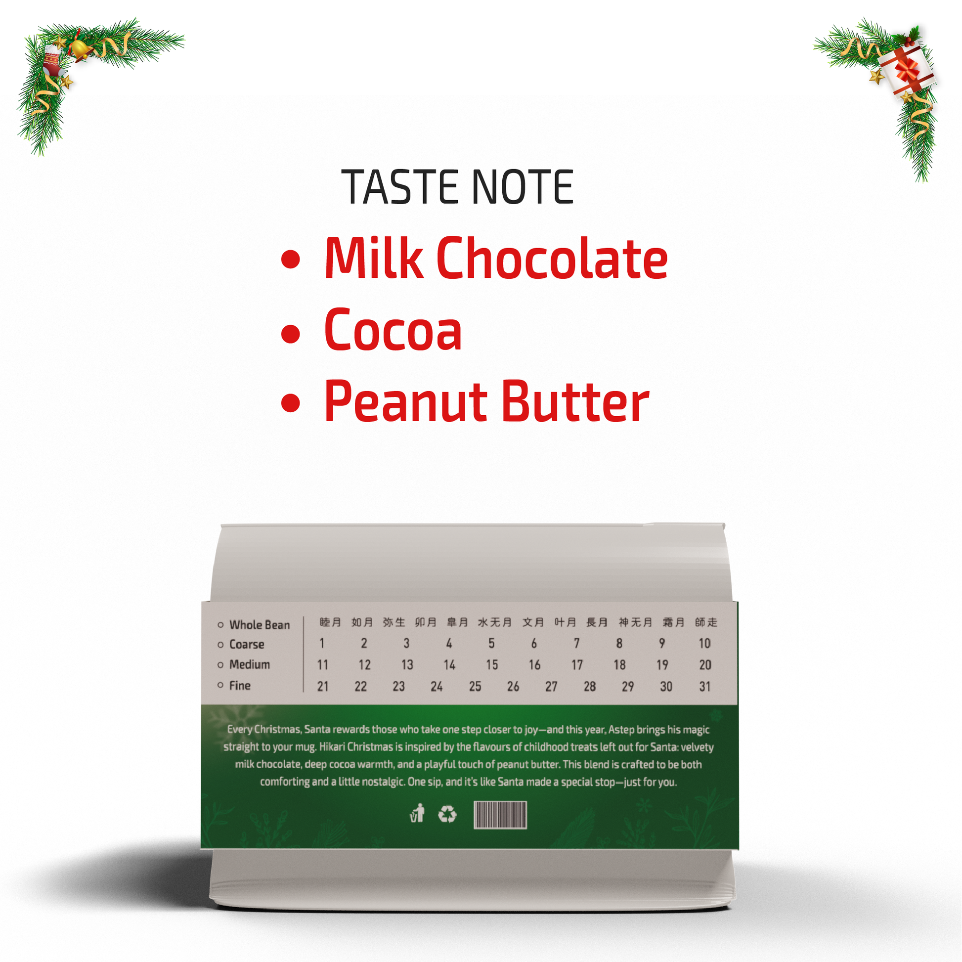 Every Christmas, Santa rewards those who take one step closer to joy—and this year, Astep brings his magic straight to your mug. Hikari Christmas is inspired by the flavours of childhood treats left out for Santa: velvety milk chocolate, deep cocoa warmth, and a playful touch of peanut butter.